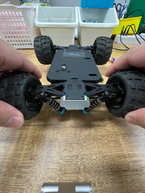 2. 두 손으로 양쪽 뒤바퀴를 동시에 굴렸을 경우 앞바퀴까지 같이 돌아가는지 확인합니다.